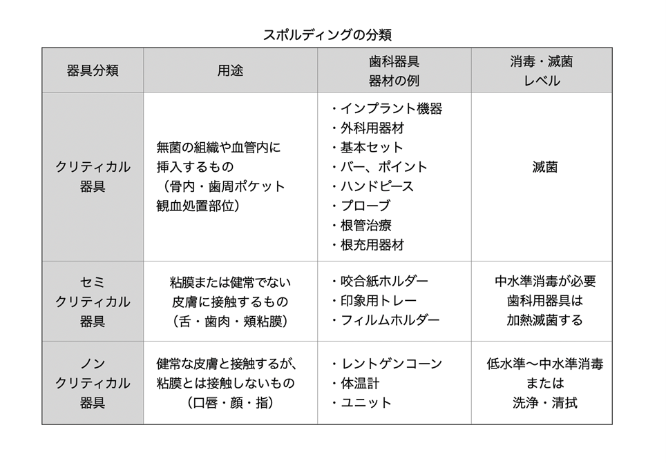 医科でも取り入れられているのがスポルディングの分類です。このような分類を明確にし、器材ごとの再生方法を統一することが重要です。たとえば、超音波洗浄はどのような器具に必要か、乾燥の工程をどのタイミングで行うかなど、工程の標準化が必要です。