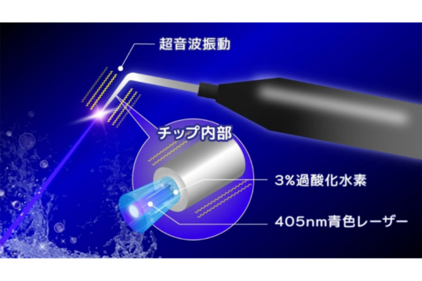 ブルーラジカルは、3%の過酸化水素と405nmの青色レーザーを同時に照射し、ヒドロキシルラジカルを発生させることで、歯周ポケット内の細菌を99.99%殺菌する新しい歯周病治療器である。