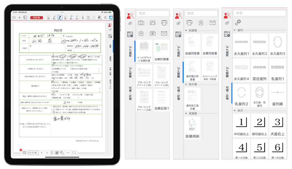 Dental eNoteは「紙と同じ感覚でページをめくり、自由に書き込める」ことが特徴です。三輪様は「写真を撮影してその場で貼り付けられるのが便利」と語り、院長先生も「思いついたことを直感的にパッと実行できる操作性こそが決め手」と評価されています。