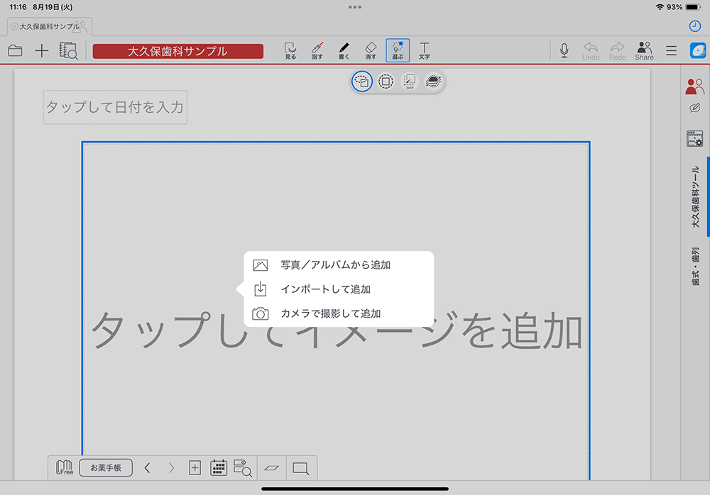 例えば、治療計画書ではレントゲン写真や口腔内写真を簡単に貼り付け、必要な情報はリストから選ぶだけで入力できます。次回予約表のテンプレートも、当日の処置内容や次回必要な項目を選択肢からタップするだけで記入できるように設計。