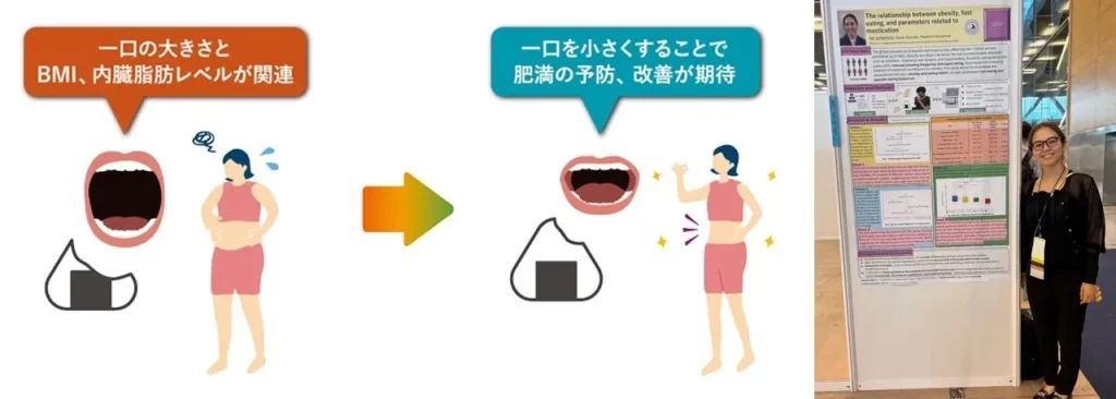 画像左:一口の大きさと肥満の関係のイメージ 画像右:IADRにてポスター発表した大阪大学大学院歯学研究科 再生歯科補綴学講座 山本梨絵先生