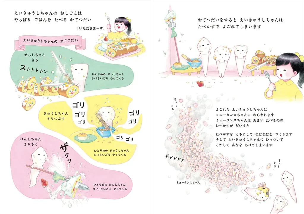 乳歯(にゅうしちゃん)が食べ物を食べやすくする役割を持ち、永久歯(えいきゅうしちゃん)が丈夫で強い歯としてごはんを食べるお手伝いをする、それぞれの役割とバトンタッチの大切さが描かれています。