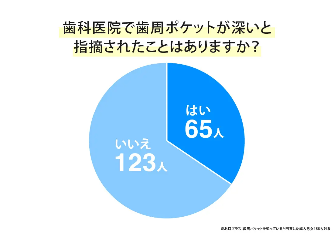 歯周ポケットを知っていると答えた188人を対象に、「歯科医院で歯周ポケットが深いと指摘されたことはありますか?」というアンケートをとった結果、約3割の人が「はい」と答えました。