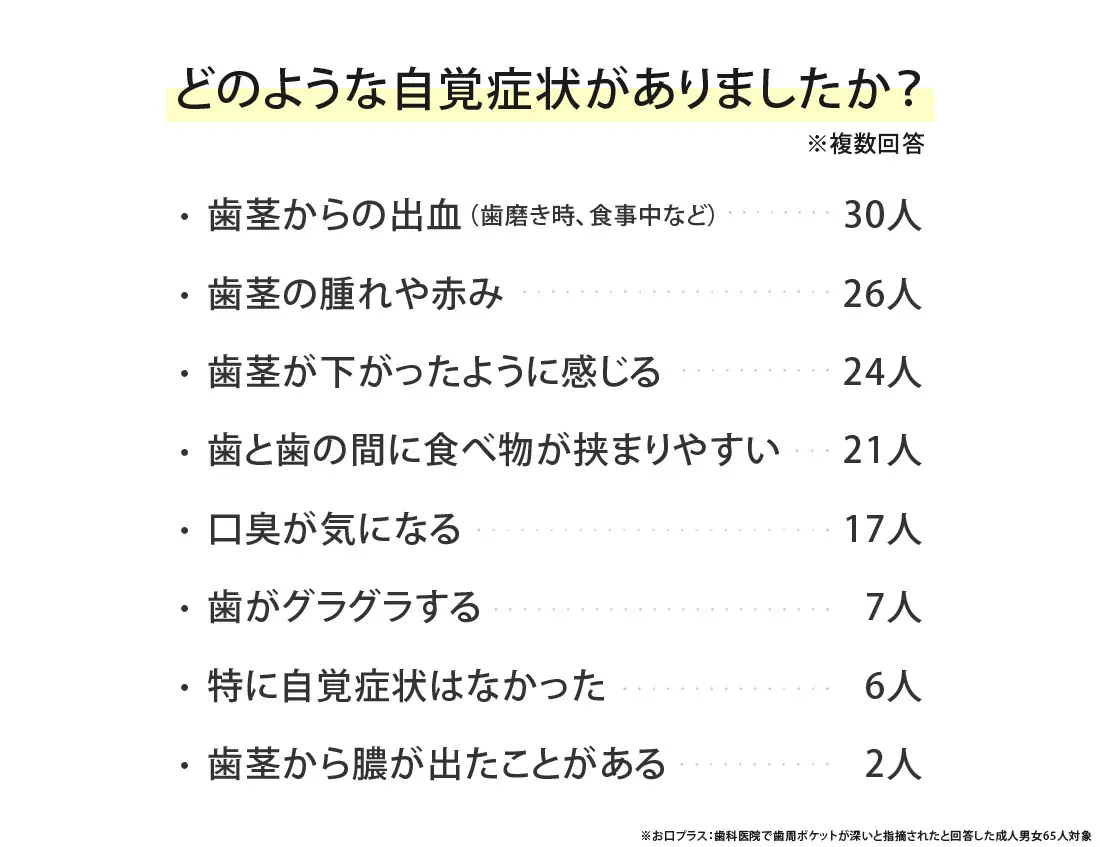 歯周ポケットが深いと指摘された65人に、どのような自覚症状があったかを複数回答で尋ねました。