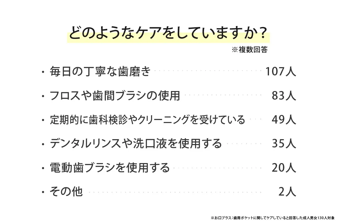 「毎日の丁寧な歯磨き」が最も多く、次いで「フロスや歯間ブラシの使用」が続きました。