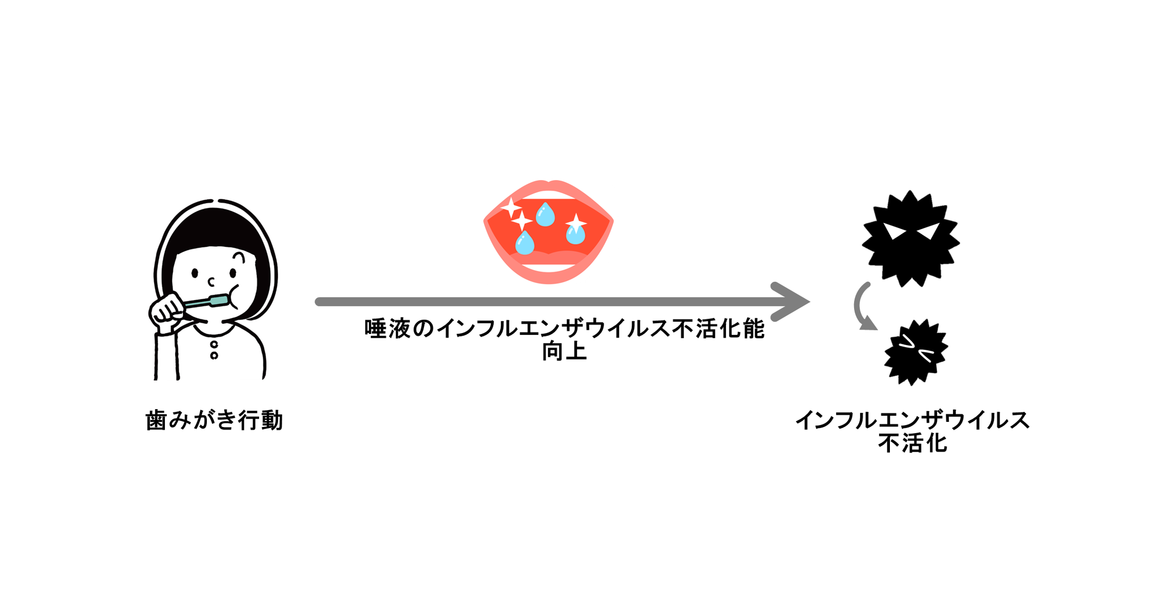 これまで、疫学調査により口腔衛生状態とインフルエンザの発症率との関連性が報告されていましたが(※2)、本研究では生化学的手法(※3)により、歯みがき行動によって唾液のインフルエンザウイルス不活化能が向上することを初めて明らかにしました。このことから、口腔内をきれいに保つことにより、ヒト本来の免疫力(唾液のインフルエンザウイルス不活化能)が向上し、外部から口腔に侵入するインフルエンザウイルスを不活化できる可能性が示されました。口腔内の健康維持のみならず、感染症への備えという観点からも、日々の丁寧な歯みがき行動が重要であると考えます。