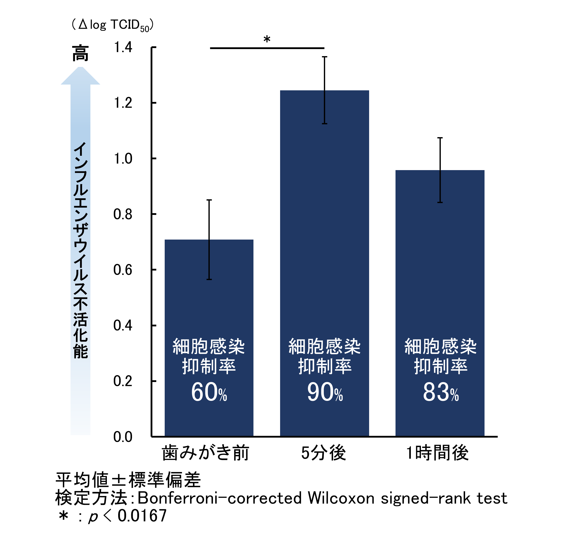 歯みがき行動前後の唾液のインフルエンザウイルス不活化能を解析した結果、歯みがき行動前と比較して、歯みがき行動5分後の唾液において、インフルエンザウイルス不活化能(細胞感染抑制率(※6))が有意に向上することを確認しました。また、有意差は認められなかったものの、歯みがき行動1時間後においても高いインフルエンザウイルス不活化能が維持される傾向が見られました(図2)。