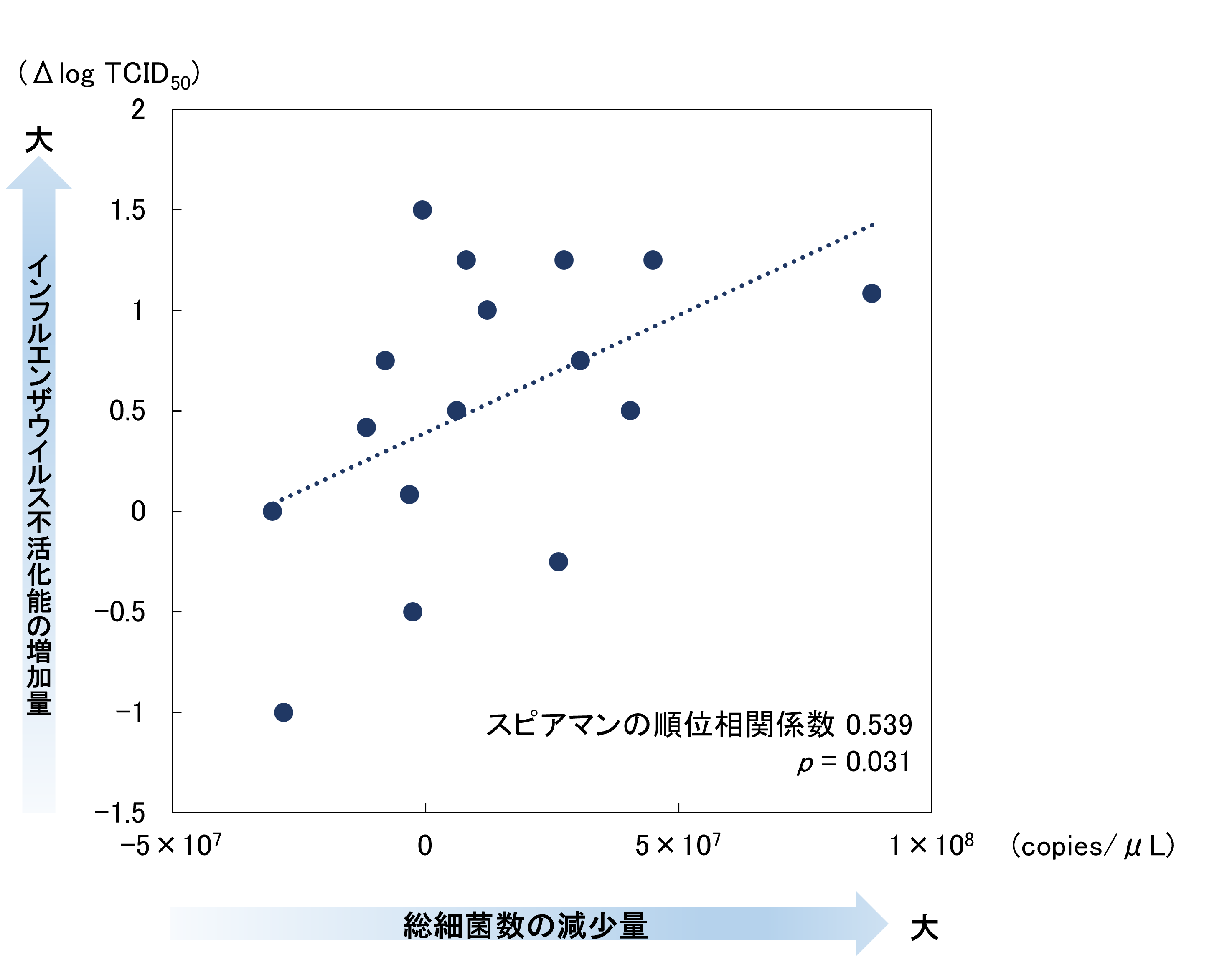 図3 歯みがき行動前後(5分後)での唾液中の総細菌数とインフルエンザウイルス不活化能の変化量との関係