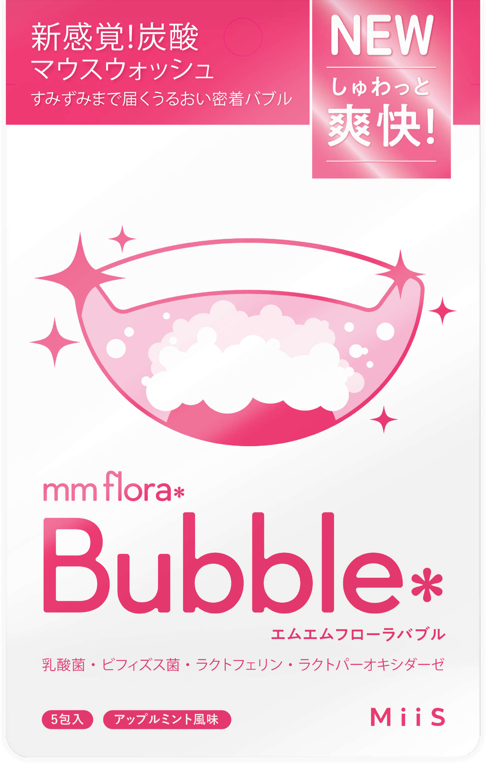 「mm flora*Bubble」は、飲み込める設計と炭酸泡の爽快感で、いつでもどこでもお口を清潔に保てる新発想のケアを実現。