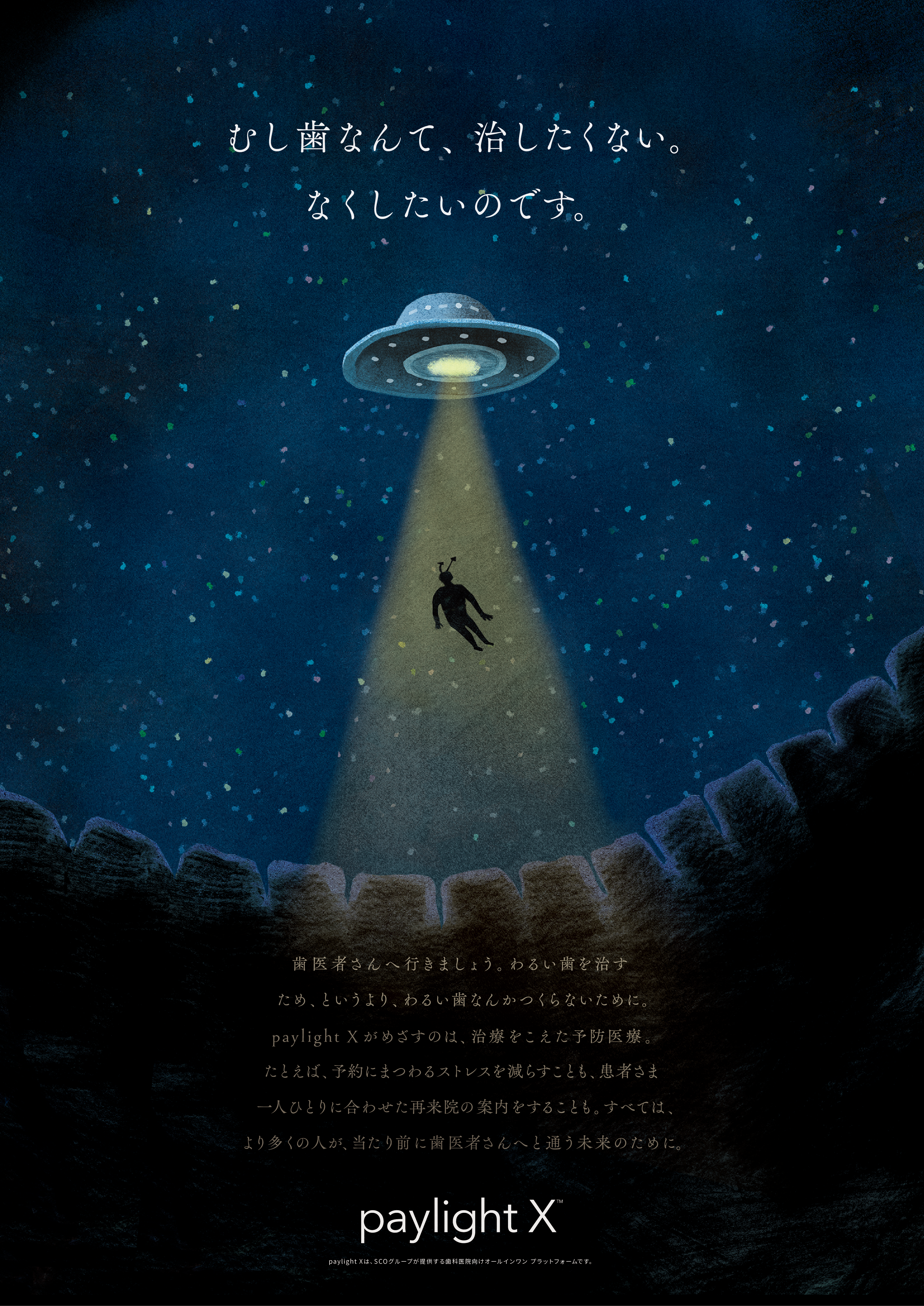 本CMでは、「むし歯なんて、治したくない。なくしたいのです。」というメッセージのもと、むし歯を“地球からなくしたい”という願いを表現しています。UFOの光に照らされる象徴的なビジュアルを通じて、予防歯科や定期受診の大切さをやさしく、印象的に伝えます。