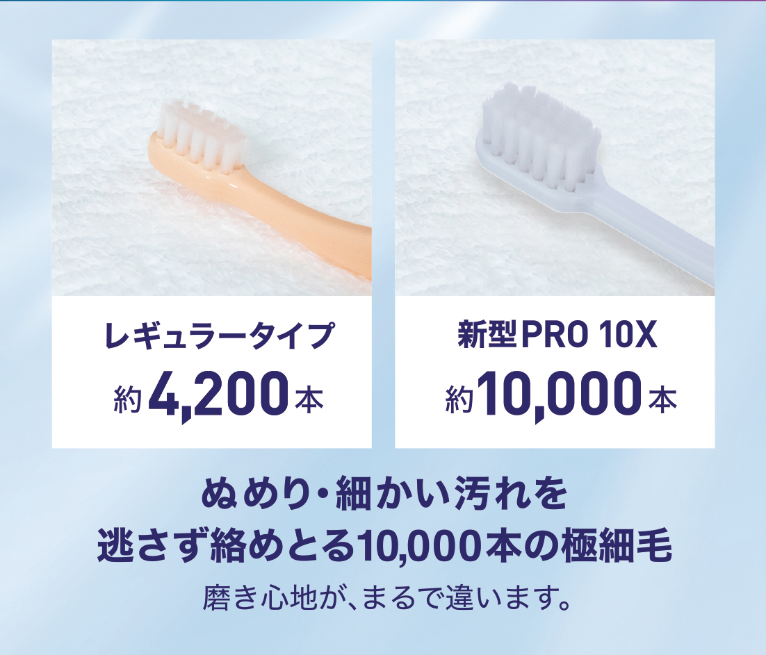 レギュラーの約4,200本に対して 約10,000本の超高密度。ぬめり・細かい汚れを逃さず絡めとり、磨き心地が大きく向上。