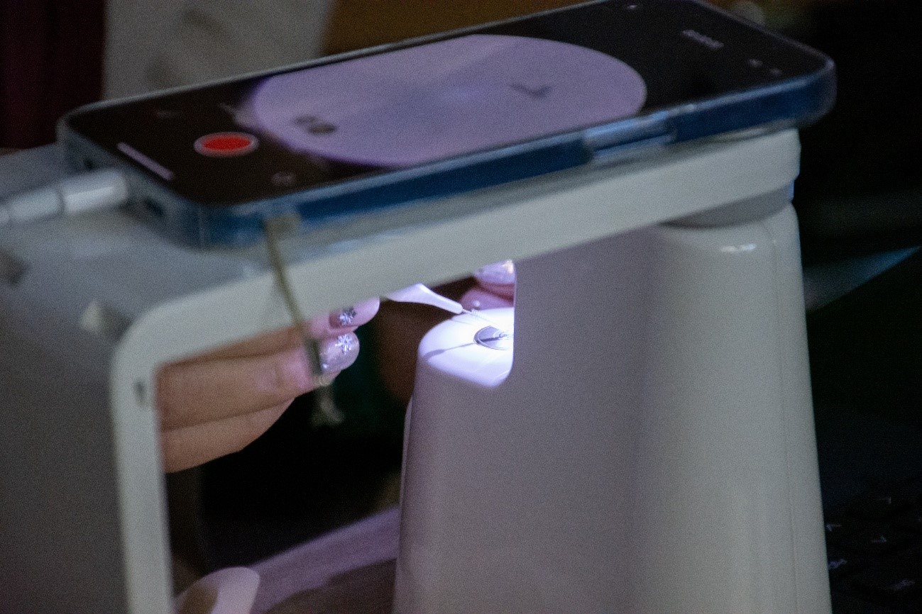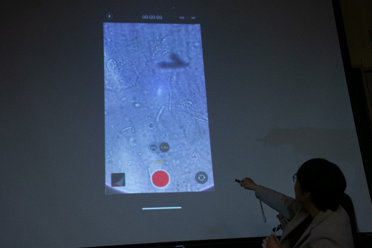後半では、スマートフォンで微生物を観察できる顕微鏡を使い、実際にお口の菌を見る体験をしました。動く菌を見て子どもたちからは、「いっぱいいる」「気持ち悪い!」などの声が上がりました。