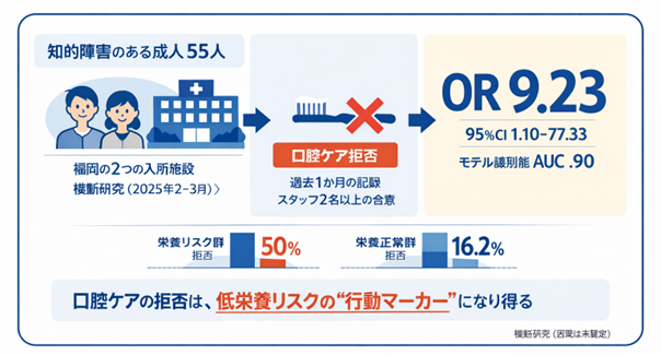 介護・支援の現場では、「歯みがきを嫌がる」「口を開けない」などの拒否は日常的に経験されます。本研究は、そうした拒否が単なる“手技上の困りごと”にとどまらず、栄養リスクに早期に気づくためのサインになり得ることを示唆します。