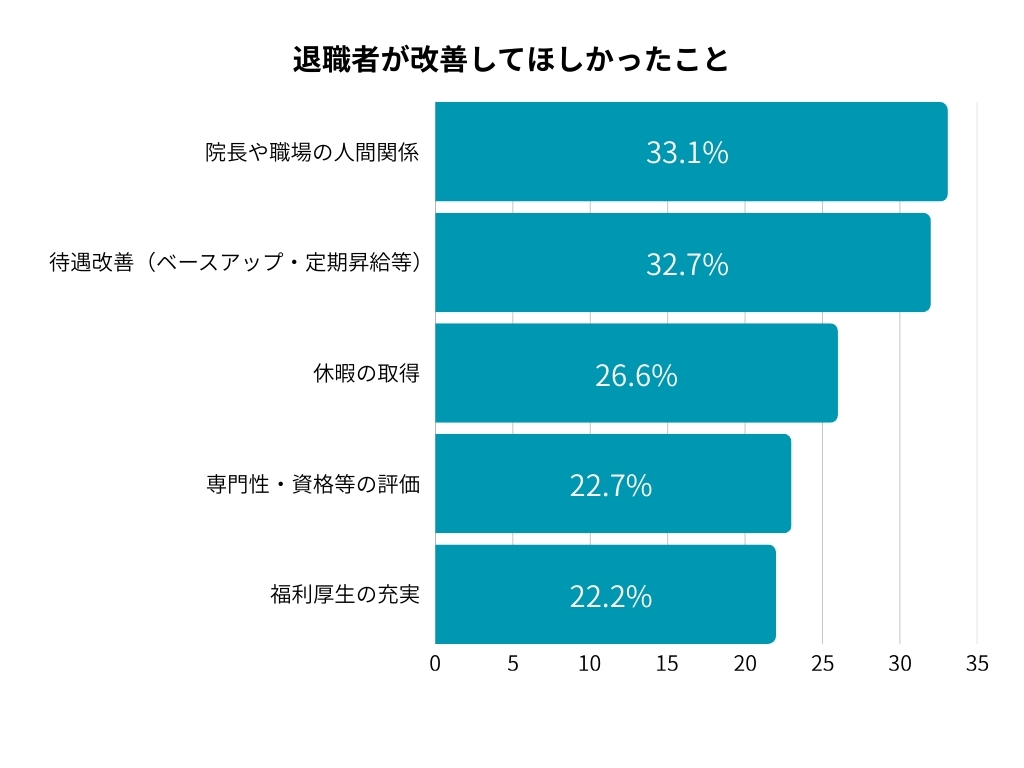 一方で、公益社団法人日本歯科衛生士会「歯科衛生士の勤務実態調査 報告書(令和7年3月)」では、退職者が「最後に勤務していた職場で改善してほしかったこと(複数回答)」として、