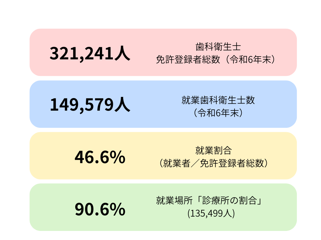 厚生労働省の「令和6年 衛生行政報告例(就業医療関係者)」結果として、日本歯科衛生士会は、令和6年末の就業歯科衛生士数が149,579人(約15万人)であると公表しています(前回・令和4年末145,183人から4,396人増)。また就業場所別では、診療所が135,499人(90.6%)と大半を占めています。