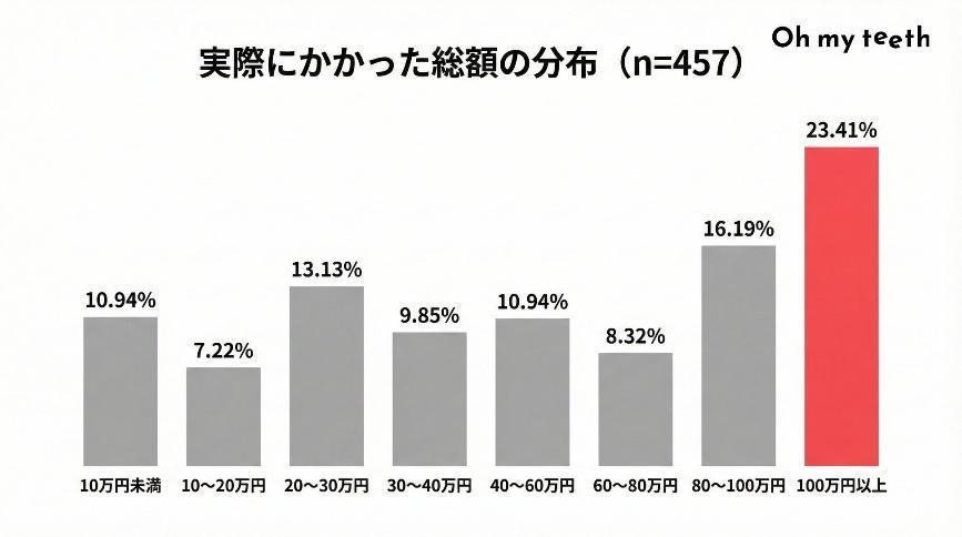 実際にかかった治療総額は、「100万円以上(23.4%)」が最多となる一方で、約 4 割が「40 万円未満」で完了しているという実態があります。この差は主に治療範囲に起因しており、部分矯正を選んだ層の約7割は40万円未満で治療を終えています。