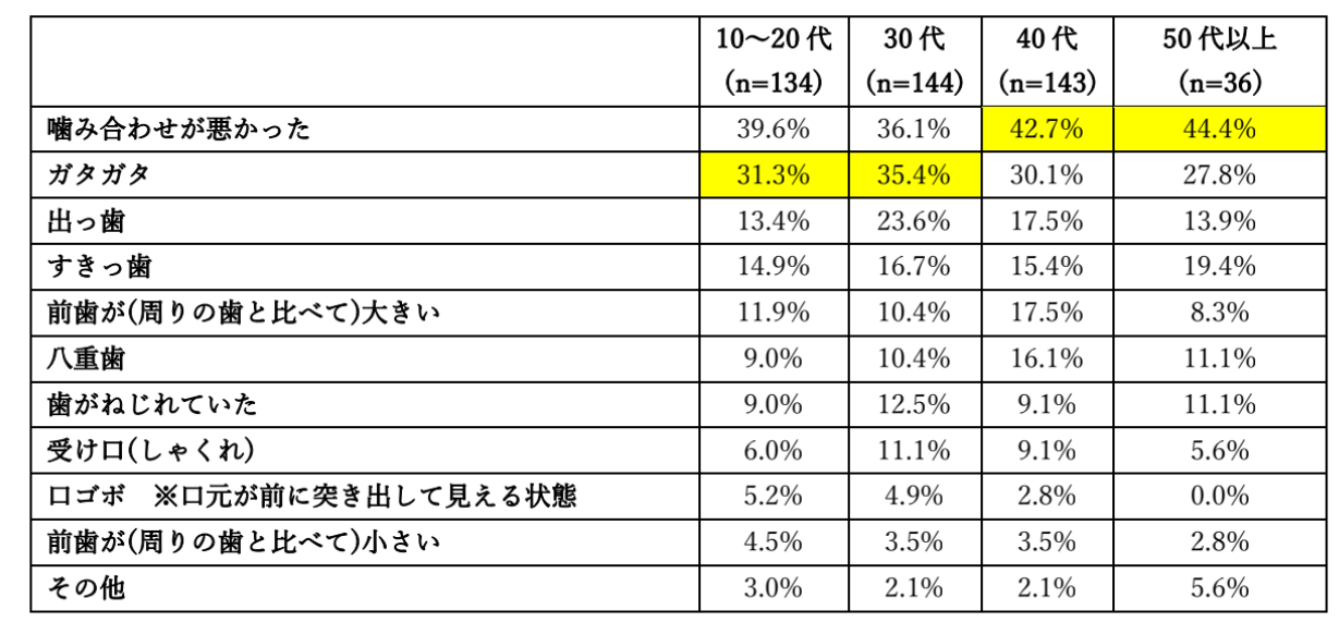 どの世代でも共通して約4割が「噛み合わせ」に悩みを抱えていますが、歯並びの悩みは世代によって異なり、若年層ほど「ガタガタ」などの審美面を気にする傾向にあります。対して40代以降になると、見た目の変化を健康リスクとして捉え、噛み合わせなどの「機能面」を重視する声が突出します。