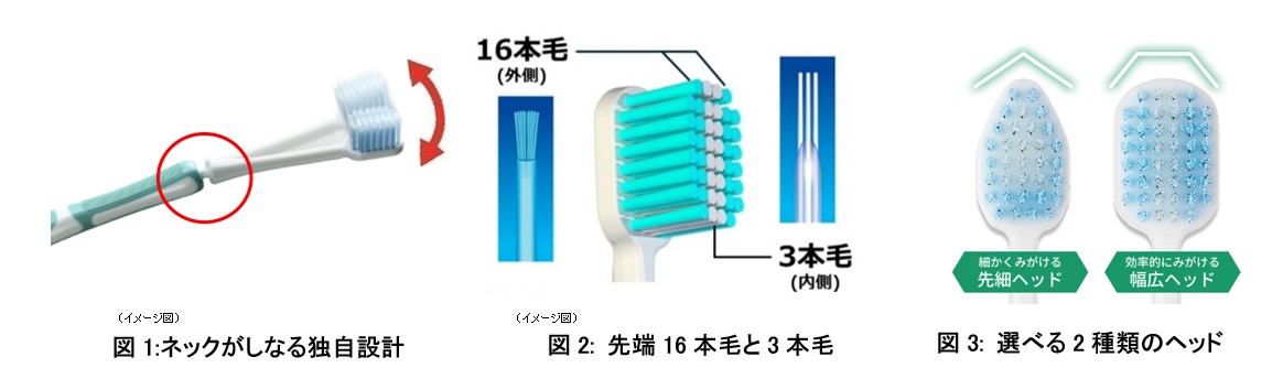 本製品のポイントは、ハブラシのネック部分にあるくびれです。ブラッシング時にくびれが適度にしなることで、余分な力を吸収し、ブラッシング圧を自動補正します。自分の行動を変えることなく、つい力を入れて歯をみがいてしまうという悩みに応える画期的なハブラシです。 歯とハグキの健康のために、歯科医がすすめている「軽い力でブラッシング」ができる設計となっています。