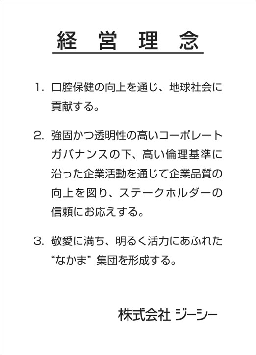 ジーシーは、これからも経営理念「口腔保健の向上を通じ、地球社会に貢献する」のもと、なかま一人ひとりが健康でいきいきと働き続けられる企業づくりを進めるとともに、健康長寿社会の実現に向けた挑戦を続けてまいります。