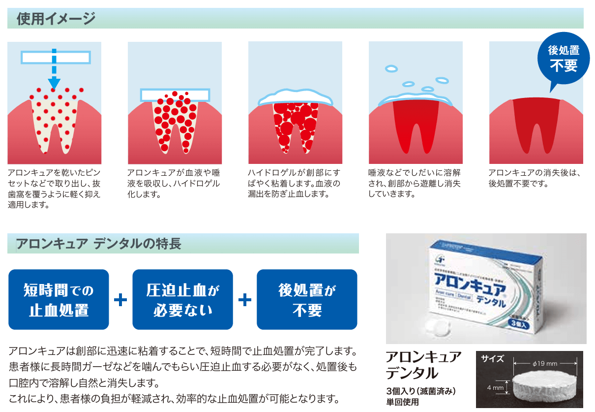アロンキュアは、“出血が止まらない”“抜歯後に困った”といった日常のピンチに期待できる、“頼れる1枚”として、全国の歯科医院に届けられようとしている。