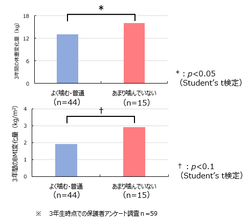 その結果、3年生時点では噛む習慣による体重やBMIの差は見られませんでしたが、「よく噛む/普通」と回答した群に比べ、「あまり噛んでいない」と回答した子どもでは、3年間での体重変化量が有意に増加しました(p<0.05)。