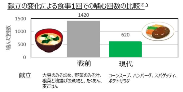 献立の変化による食事1回あたりの噛む回数を比較したデータでは、戦前は約1420回であったのに対し、現代の献立では約620回と、大幅に減少していることが示されています。
