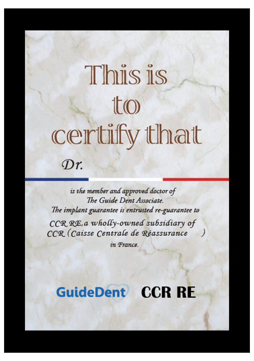 - ガイドデント保証システムは、独自の審査項目で認定された認定歯科医療機関で行われたインプラント治療・審美歯科治療後の安心をサポートします。万が一の不具合が発生した場合は、再治療費を上限金額まで保証いたします。また、患者様が引越しなどで転医された場合も、引き続きサポートを提供いたします。