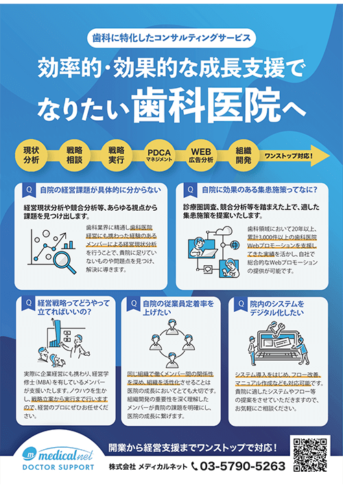 - メディカルネット ドクターサポートグループは、歯科医院経営をトータルで支援する専門チームです。事務・経理・人事から集患・経営戦略・開業・資産形成までを一気通貫でサポート。部分最適にとどまらず、医院全体の成長と安定を実現する「全体最適の経営設計」を提供します。