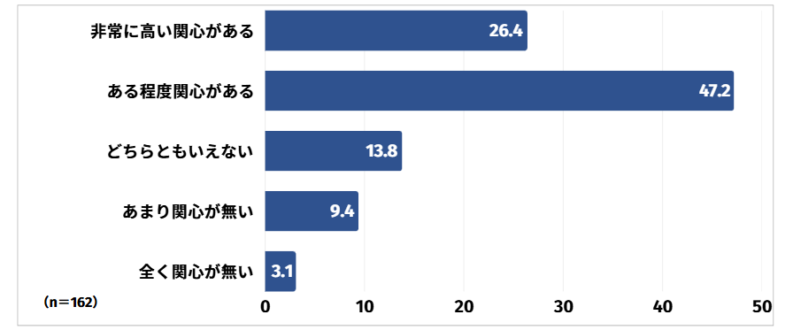 ある程度関心があると回答した方は47.2%と最も多く、次いで非常に高い関心があると回答した方が26.4%、どちらともいえないと回答した方が13.8%という結果となりました。