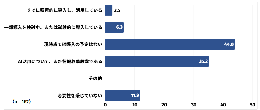 現時点では導入の予定はないと回答した方は44.0%と最も多く、次いでAI活用について、まだ情報収集段階であると回答した方が35.2%、必要性を感じていないと回答した方が11.9%という結果となりました。