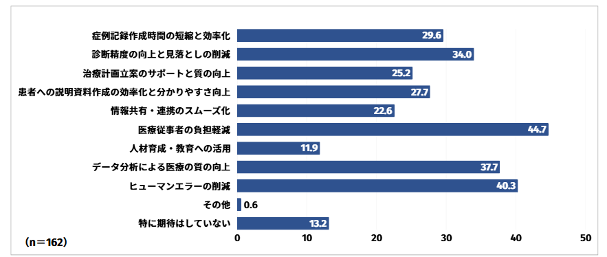 医療従事者の負担軽減と回答した方は44.7%と最も多く、次いでヒューマンエラーの削減と回答した方が40.3%、データ分析による医療の質の向上と回答した方が37.7%という結果となりました。