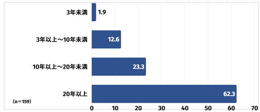 20年以上と回答した方は62.3%と最も多く、次いで10年以上~20年未満と回答した方が23.3%、3年以上~10年未満と回答した方が12.6%という結果となりました。