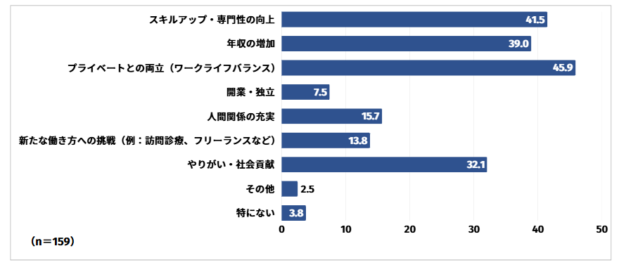 プライベートとの両立(ワークライフバランス)と回答した方は45.9%と最も多く、次いでスキルアップ・専門性の向上と回答した方が41.5%、年収の増加と回答した方が39.0%という結果となりました。
