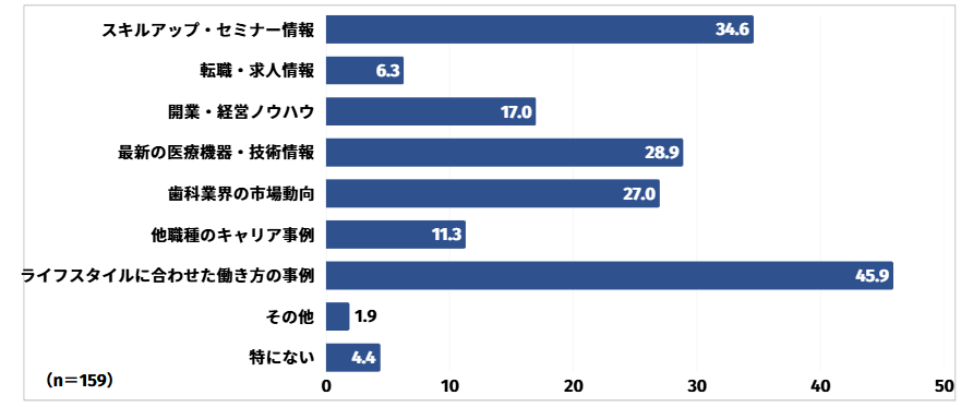 ライフスタイルに合わせた働き方の事例と回答した方は45.9%と最も多く、次いでスキルアップ・セミナー情報と回答した方が34.6%、最新の医療機器医・技術情報と回答した方が28.9%という結果となりました。