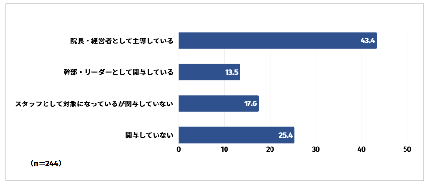 院長・経営者として主導していると回答した方は43.4%と最も多く、次いで関与していないと回答した方が25.4%、スタッフとして対象になっているが関与していないと回答した方が17.6%という結果となりました。