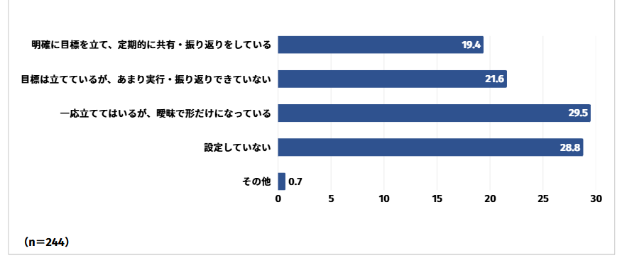 一応立ててはいるが、曖昧で形だけになっていると回答した方は29.5%と最も多く、次いで設定していないと回答した方が28.8%、目標は立てているが、あまり実行・振り返りできていないと回答した方が21.6%という結果となりました。