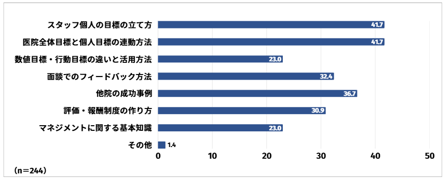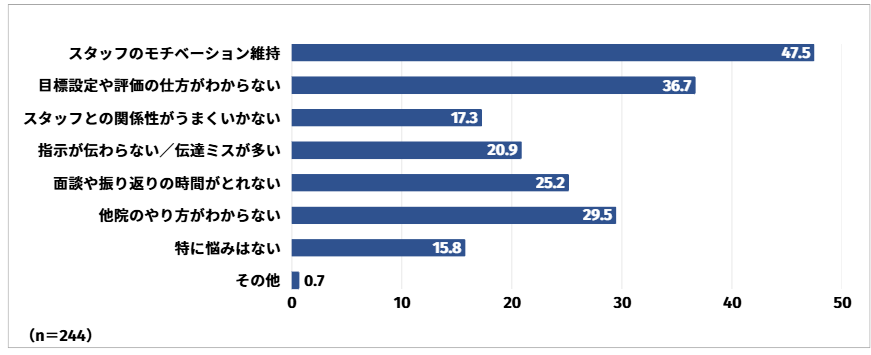 スタッフのモチベーション維持は最も多く47.5%、次いで目標設定や評価の仕方が分からないと回答した方が36.7%、他院のやり方かわからないと回答した方が29.5%という結果となりました。