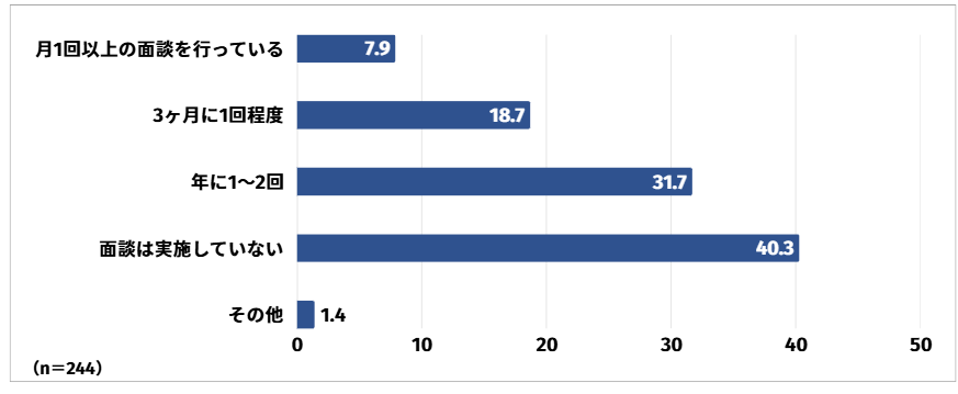 面談は実施していないと回答した方は最も多く40.3%、次いで年に1~2回と回答した方が31.7%、3か月に1回程度と回答した方が18.7%という結果となりました。