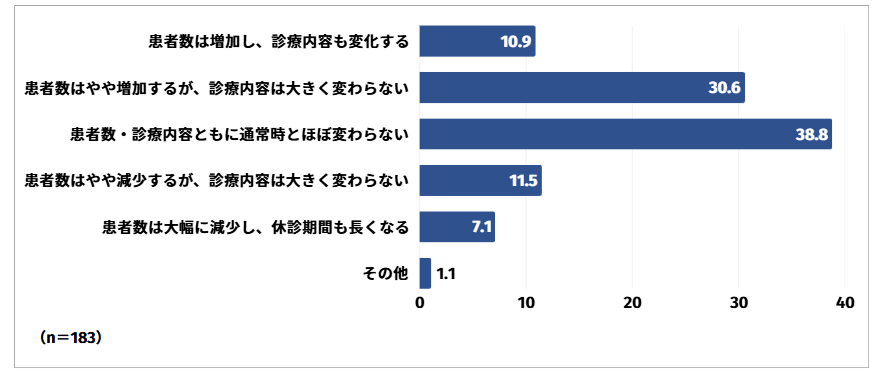 患者数・診療内容ともに大きく変わらないと回答した方は38.8%と最も多く、次いで患者数はやや増加するが、診療内容は大きく変わらないと回答した方が30.6%、患者数はやや減少するが、診療内容は大きく変わらないと回答した方が11.5%という結果となりました。