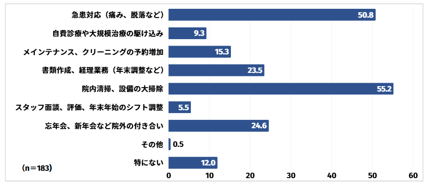院内清掃、設備の大掃除と回答した方は55.2%と最も多く、次いで急患対応(痛み、脱落など)と回答した方が50.8%、忘年会、新年会などの院外の付き合いと回答した方が24.6%という結果となりました。