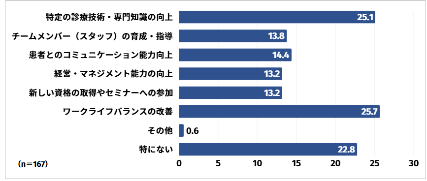ワークライフバランスの改善と回答した方は25.7%と最も多く、次いで特定の診療技術・専門知識の向上と回答した方が25.1%、特にないと回答した方が22.8%という結果となりました。