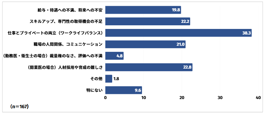 仕事とプライベートの両立(ワークライフバランス)と回答した方は38.3%と最も多く、次いで(開業医の場合)人材採用や育成の難しさと回答した方が22.8%、スキルアップ、専門性の取得機会の不足と回答した方が22.2%という結果となりました。