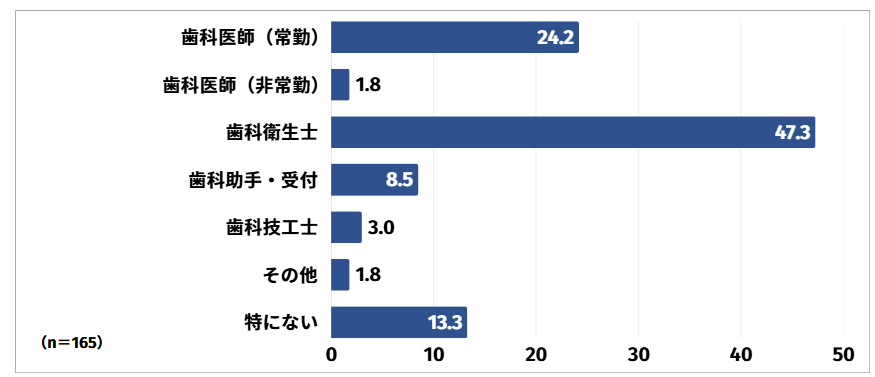 歯科衛生士と回答した方は47.3%と最も多く、次いで歯科医師(常勤)と回答した方が24.2%、特にないと回答した方が13.3%という結果となりました。