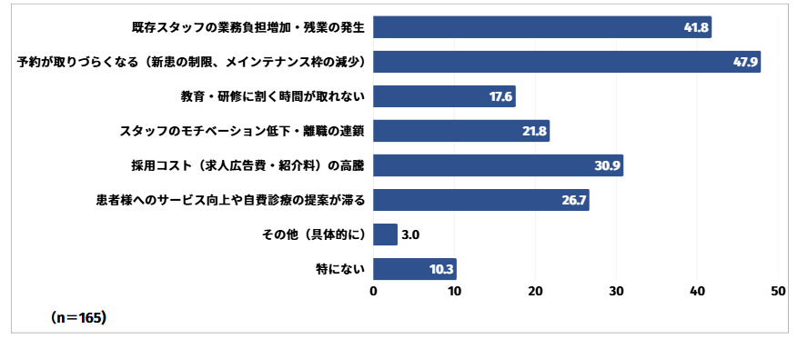 予約が取りづらくなる(新患の制限、メインテナンス枠の減少)と回答した方は47.9%と最も多く、次いで既存スタッフの業務負担増加・残業の発生と回答した方が41.8%、採用コスト(求人広告費・紹介料)の高騰と回答した方が30.9%という結果となりました。