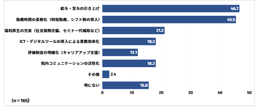給与・賞与の引き上げと回答した方は46.7%と最も多く、次いで勤務時間の柔軟化(時短勤務、シフト制の導入)と回答した方が45.5%、福利厚生の充実(社会保険完備、セミナー代補助など)と回答した方が21.2%という結果となりました。