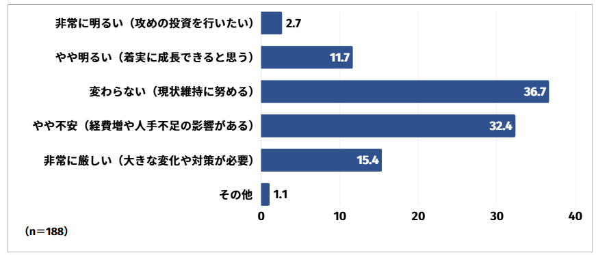 変わらない(現状維持に努める)と回答した方は36.7%と最も多く、次いでやや不安(経費増や人手不足の影響がある)と回答した方が32.4%、非常に厳しい(大きな変化や対策が必要)と回答した方が15.4%という結果となりました。