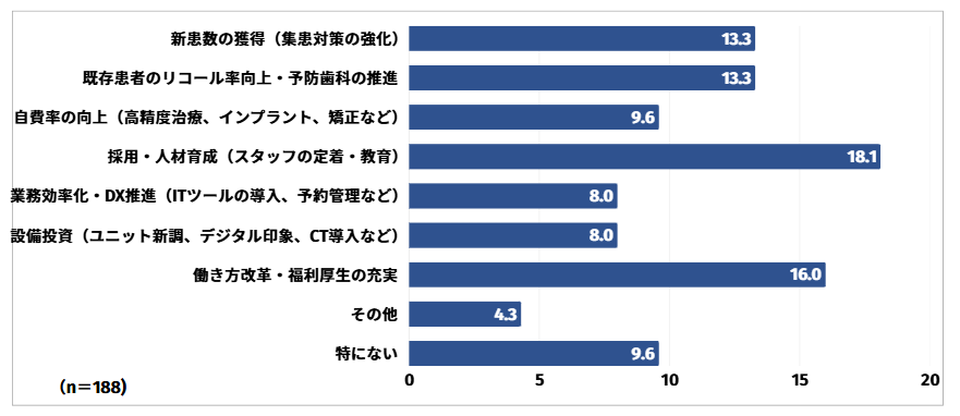 採用・人材育成(スタッフの定着・教育)と回答した方は18.1%と最も多く、次いで働き方改革・福利厚生の充実と回答した方が16.0%、新患数の獲得(集患対策の強化)・既存患者のリコール率向上・予防歯科の推進と回答した方が13.3%という結果となりました。