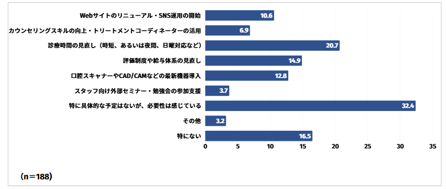 特に具体的な予定はないが、必要性は感じていると回答した方は32.4%と最も多く、次いで診療時間の見直し(時短、あるいは夜間、日曜対応など)と回答した方が20.7%、特にないと回答した方が16.5%という結果となりました。