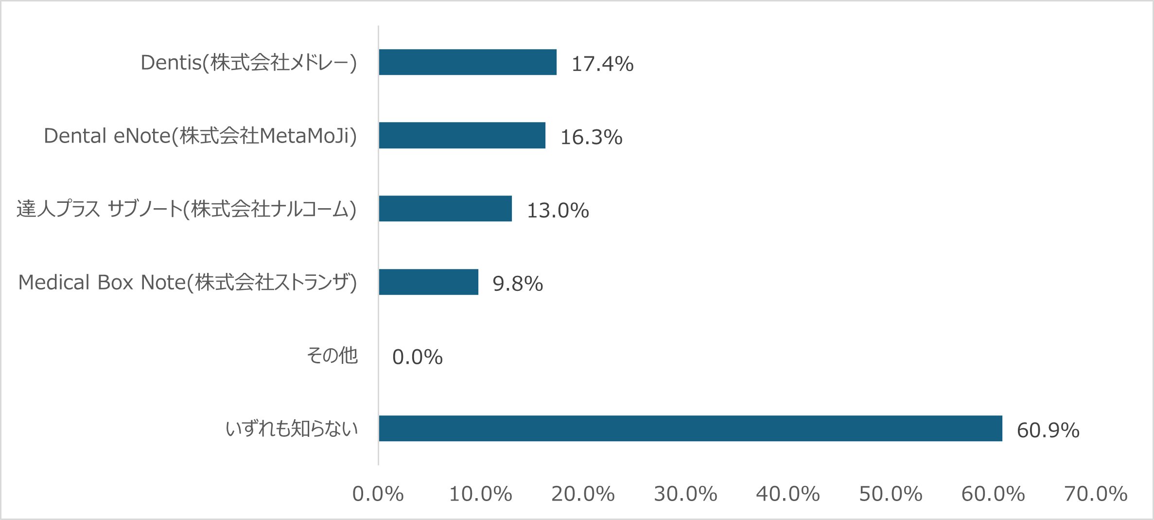 ツールの認知度と、実際の導入状況(利用率)を比較すると、興味深い結果が見えてきました。 認知度でトップだったのは、電子カルテ機能との連携で知られる株式会社メドレーの「Dentis(17.4%)」でした 。