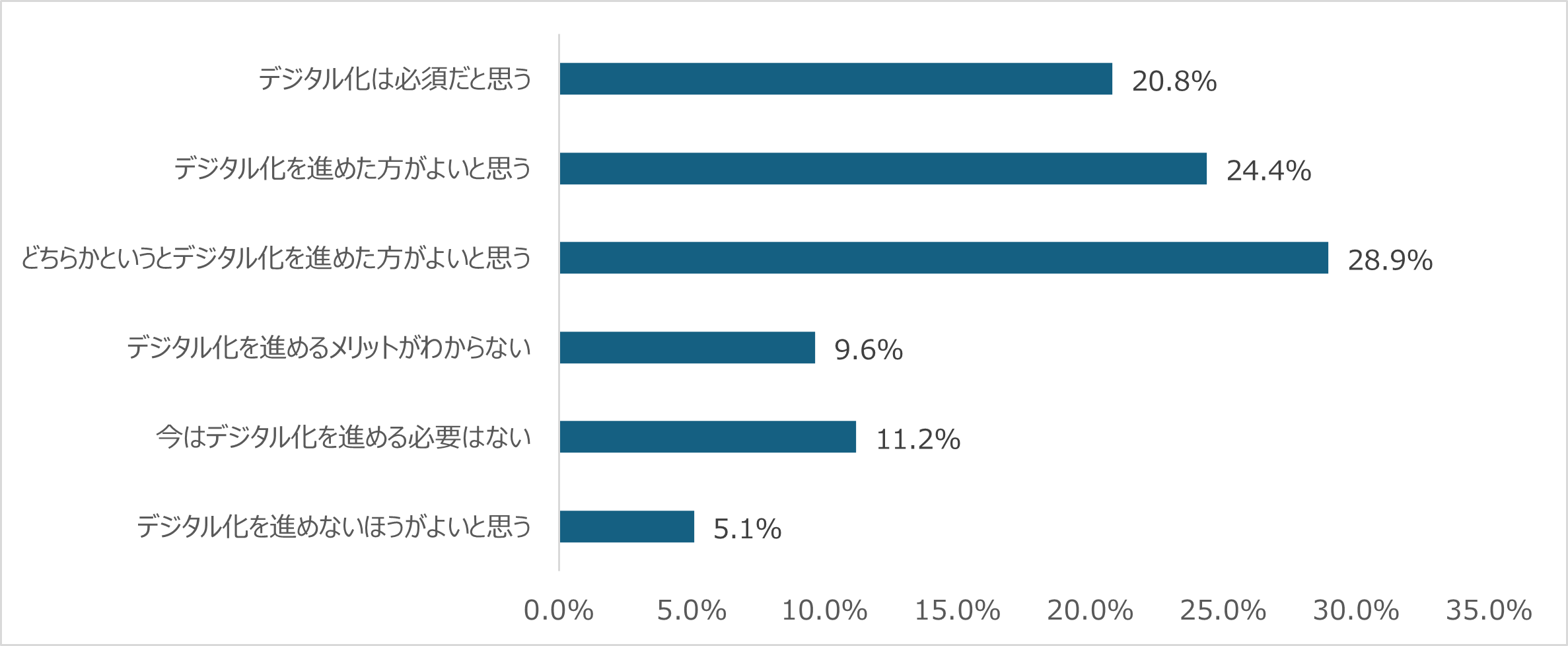 *「デジタル化を進めるメリットがわからない」「今はデジタル化を進める必要はない」「デジタル化を進めない方がよいと思う」を否定的な回答としています